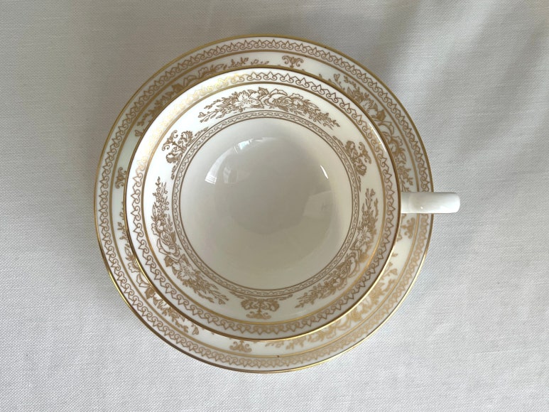 웨지우드의 콜럼비아 골드 피오니잔 소서 듀오 세트입니다