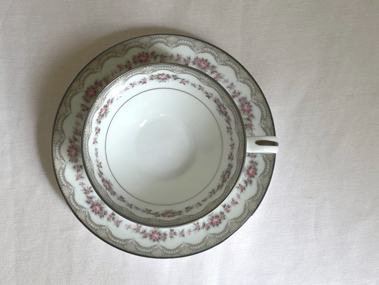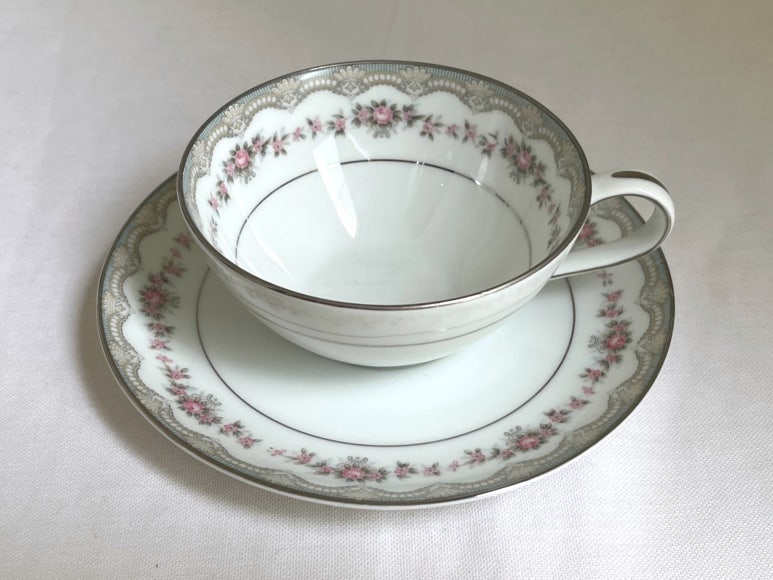 노리다케의 글렌우드 패턴은 1956년부터 1981년까지 생산된 일본산 본차이나 테이블웨어입니다. 이 패턴은 흰색 바탕에 분홍 장미와 회색/황갈색 테두리, 플래티넘 트림으로 장식되어 우아하고 고전적인 분위기를 자아냅니다 . 플래티넘 트림이 적용되어 전자레인지 사용은 권장되지 않으며, 현재는 단종되어 수집가들 사이에서 희소성과 가치가 높습니다