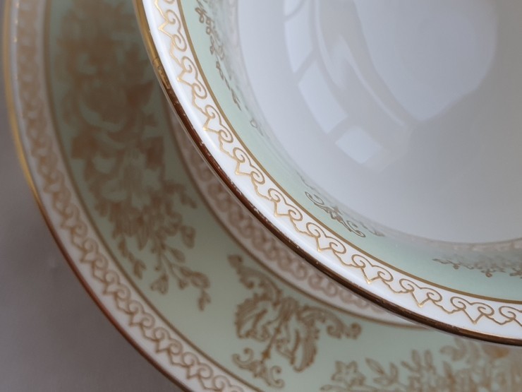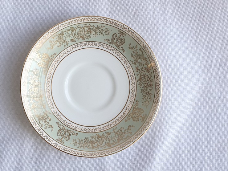 웨지우드 콜럼비아 세이지 그린 피오니잔 소서 듀오 세트입니다 1966년부터 2014년까지 생산된 제품입니다 ...