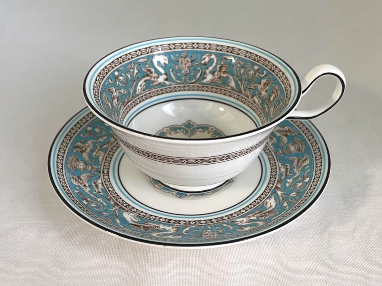 웨지우드의 플로렌틴 터콰즈는 1931년에 처음 출시된 본차이나 테이블웨어 컬렉션으로, 신화적 생물과 환상적인 식물이 정교하게 수작업으로 그려진 디자인이 특징입니다. 이 패턴은 흰색 본차이나 바탕에 생동감 있는 터콰즈 블루와 검은색 에나멜 테두리로 마감되어 고급스러움을 더합니다. 플로렌틴 시리즈는 1874년에 처음 소개되었으며, 터콰즈 버전은 그 중에서도 가장 오랜 기간 동안 생산된 인기 라인입니다. 현재도 영국 스토크온트렌트에서 수작업으로 제작되며, 다양한 색상으로도 출시되어 전통과 현대를 아우르는 디자인으로 사랑받고 있습니다.